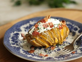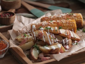 감자사이 녹아든 치즈, 살포시 내려앉은 요거트와 베이컨의 조합.
