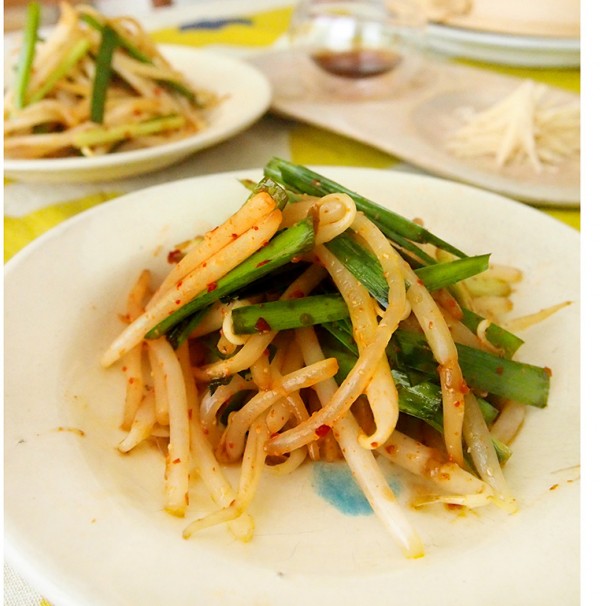 2. 그릴 팬에 물을 자작하게 붓고 그릴 망을 넣고 그 위에 오븐 시트를 깐다. 콩나물, 부추를 올리고 다른 그릴 팬으로 뚜껑을 덮는다.