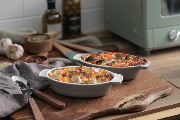 그라탕 용기에 펜네면과 닭을 넣고 크림소스와 피자치즈를 얹는다.